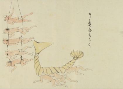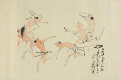 这一特殊画卷是日本早稻田大学收藏的一部分,作者是名为Kanshou的艺术家。他的画作大多简明,他笔下的人物通常细长而又瘦弱,这使得他笔下的人类和恶魔都看上去非常卡通化。这种涂鸦风格与时而荒谬的情景相结合,形成了一幅幅非常萌的画作。