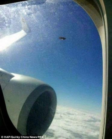 照片于2012年在一架从香港飞往中国大陆西南部的客机上拍摄,一个UFO在客机窗外飞过。