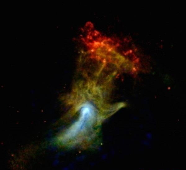 美国宇航局认为这张照片看起来有点像“上帝之手”,因而以此命名。但是这张合成照片事实上是一颗恒星爆炸后留下来的一团物质。