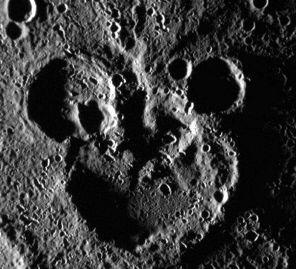 在2012年拍摄的这张水星照片中我们可以看到米老鼠的形象,这其实是由星球表面诸多陨石坑中的三个构成的。