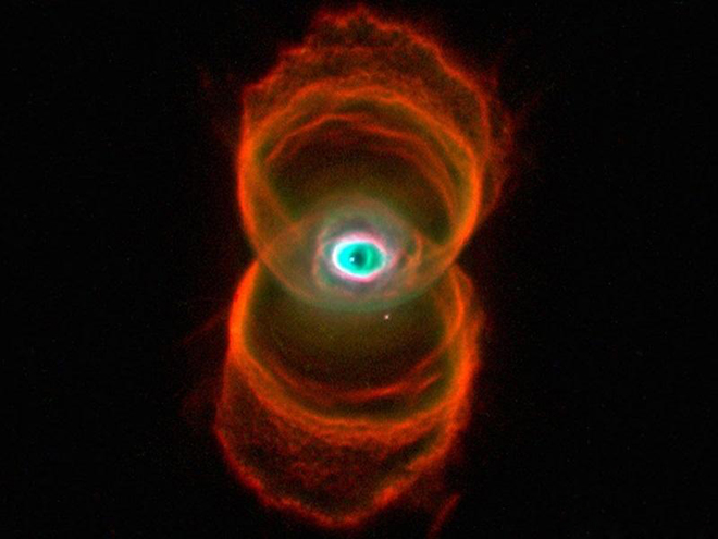哈勃太空望远镜拍摄到的这张星云照片看起来就像一只猫的眼睛。这个星云事实上是由一颗濒亡恒星(瞳孔处)形成的。这颗恒星不断向尘埃层(酷似虹膜)喷吐大量物质。