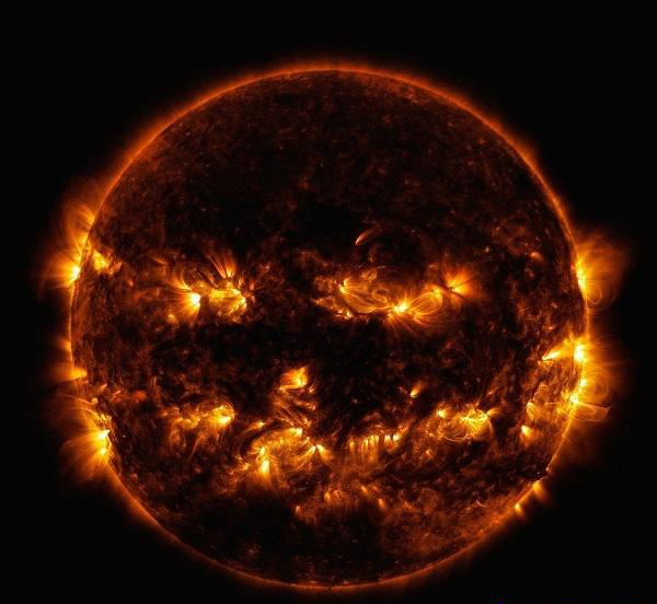 从这张照片中你可以看到太阳呈现出南瓜灯一样的笑容,这是去年万圣节前夕美国宇航局的太阳动态观测卫星拍摄到的。构成眼睛和笑容的部分事实上都是非常强大的耀斑。
