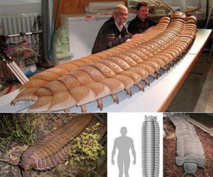 巨型蜈蚣:Euphoberia从外型和行为特征方面非常像现代蜈蚣,区别之处在于它的体长超过1米,考古学家在欧洲和北美洲发现这种远古巨型蜈蚣化石,科学家并不确切清楚它们的食物。相比之下,现代蜈蚣体长仅25厘米,可以捕食鸟类、蛇和蝙蝠。
