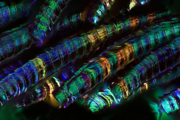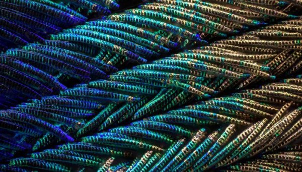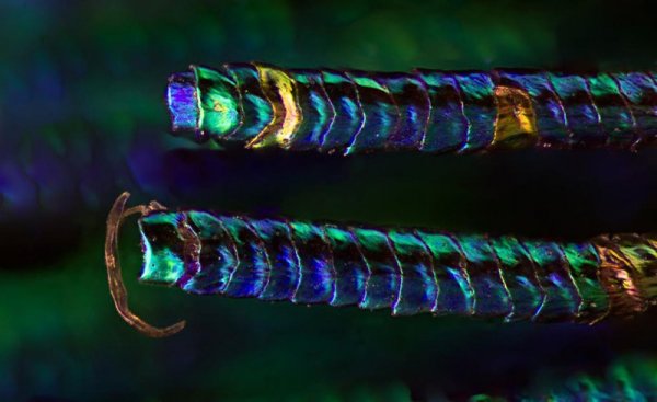 Nell之前就拍摄过孔雀羽毛,但是放大的倍数不够。这次,他要拍摄更多的围观结构,展示“每个单独的羽枝都有着不同的颜色。”他并没有使用电子显微镜,但是他的奥林巴斯BX53成功完成了任务。因为受限于景深,为了获取整个视野,他用上了一种叫做照片重叠的技术:用不同的对焦拍下几十张招聘,然后把它们叠在一起。