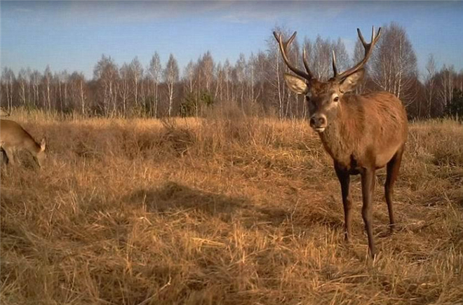 在近期一项最新研究中,研究人员并未发现证据表明高剂量放射可使动物数量下降,禁区内野生动物数量很多。图中是相机拍摄的一只鹿。