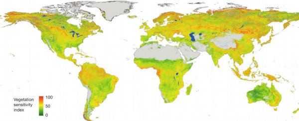 一组国际科学家团队通过一种新型度量标准“植被敏感性指数”,绘制出一张世界地图,该地图显示出地球上哪些地区最有可能被气候转变所影响。