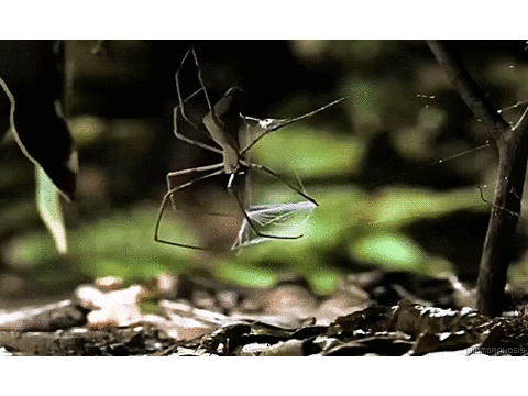 妖面蛛的捕食方式十分奇特,它会用四条腿挂在树枝上,另外四条腿会织一个缩小版的蛛网,然后撑开,等待猎物经过,一旦有体型合适的动物经过,妖面蛛就如同撒网的渔夫一般,撑开”渔网",把猎物罩住,然后拉回来,用长牙迅速解决猎物,这一切只发生在一瞬间。