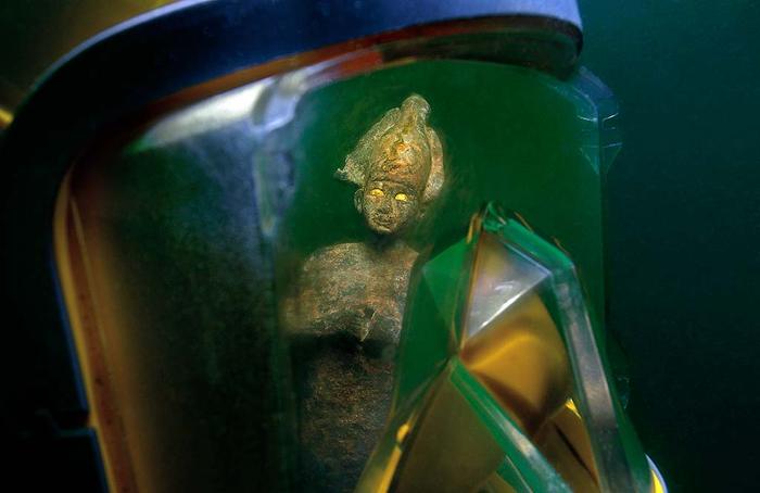 潜水夫们及他们的研究团队小心翼翼地将雕象抬出海面,以妥善保存和保护好这个历史作品,它将安全地留驻在博物馆里。