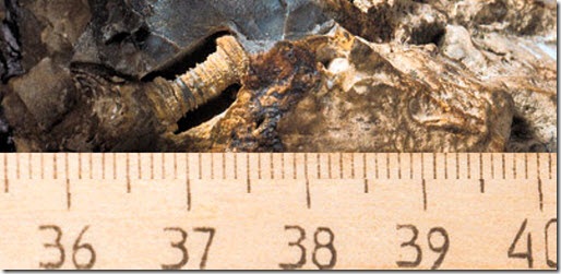 本来他们要寻找的是俄罗斯卡卢加地区陨石的遗骸。但是他们却找到了此螺丝,而更令人难以置信的是,经过了古生物学分析后,得到的结果是这化石的年龄大概是在3亿和3.2亿年之间。他们使用X光来分析这化石,并发现它里面有着一个螺丝。