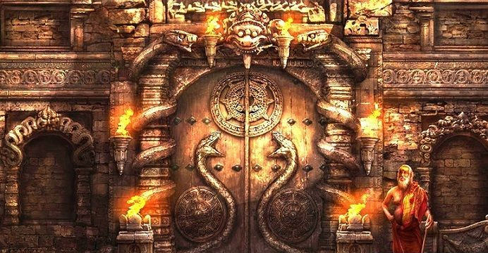 古代帕德玛纳巴史瓦米神庙(Padmanabhaswamy)的神秘之门被两个巨大的眼镜蛇画保护着,并且没有螺栓、门锁或任何其他进入方式。 据说里面拥有难以想象的财富,只能由法力高深的印度苦行僧(SADHUS)唱诵揭路荼咒语(GARUDA MANTRA)才能进入。