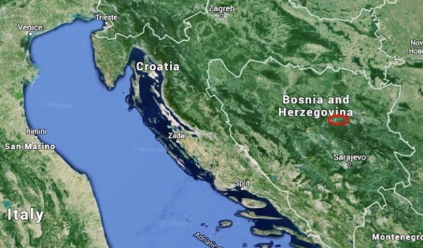 波斯尼亚的红圈是考古学家山姆奥斯马纳基奇发现巨大石球的区域, 他说,这可能可以证明远古的先进文明曾经存在在这个世界的一部分。
