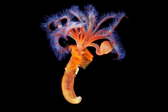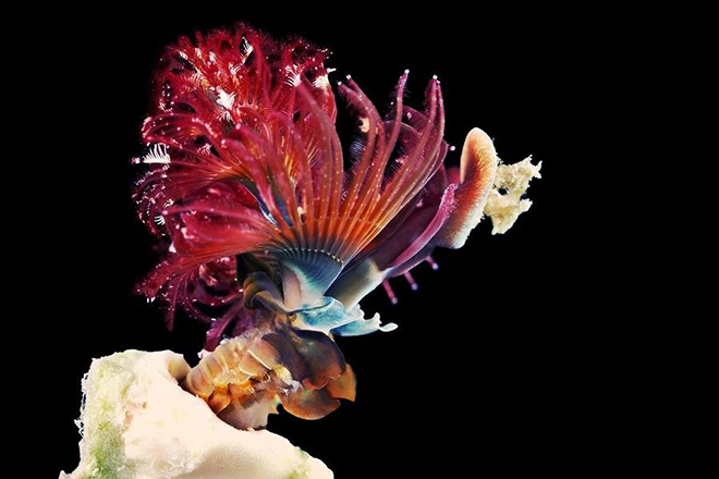 他的许多照片都来自于他探险期间收集并带到实验室的生物。这种名为Flabellina Polaris的海参非常的精美,后来他开始在自然环境中对它们进行拍摄。从照片中你可以看到它正在产卵。