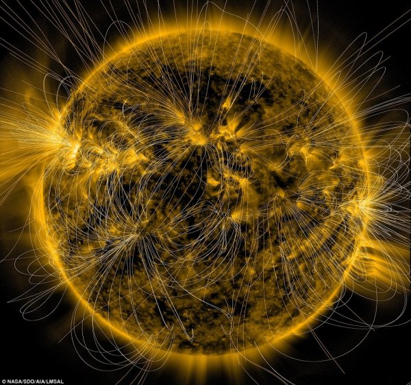 2016年3月12日,NASA的太阳动力学天文台拍摄了一张照片,研究人员据此描绘出太阳的磁场。科学家可以通过这些复杂的线条,了解太阳磁场随表面及内部不断运动而产生变化的方式。从图中可以看出,太阳表面的亮斑附近的磁场线最为密集——这些亮斑是磁场十分活跃的区域,另外还有许多磁场线连接着不同的活跃区域。
