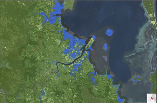 最差情景下预测的2100年布里斯班海平面位置,淡蓝色代表淹没区域。NCCARF