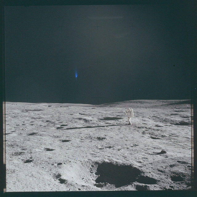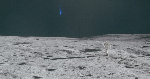 还有另一个非常有趣的月球影像,这个奇怪的蓝色UFO在那里做什么?这个神秘的蓝色UFO实际上出现在很多其它月球照片里。