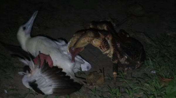 根据《每日邮报》报道,美国达特茅斯学院(Dartmouth College)研究员莱德尔(Mark Laidre)前往印度洋的查戈斯群岛(Chagos Archipelago)进行研究,目击到晚上一只椰子蟹,爬到鸟群的巢穴,捕捉到一只海鸟,然后它的大螯就宛如狮子的下颚一般,钳住海鸟的身体,翅膀甚至因此被折断,失去飞行能力。