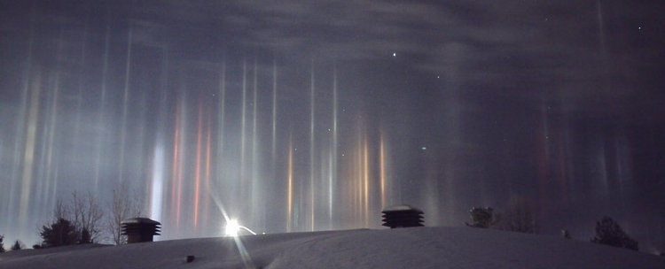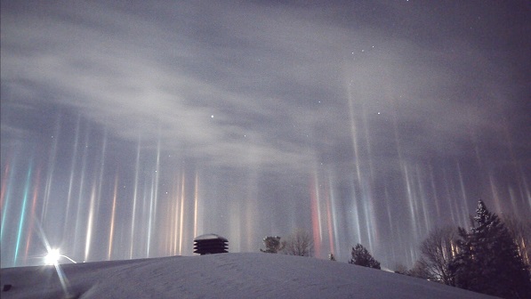 这些光实际上叫光柱,是一种蛮常见的大气现象。虽然它们看起来很像极光,但它们跟极光却一点关系也没有。极光是带电的粒子和高层大气中的原子碰撞造成的特殊发光现象。而光柱的发生则是当平面的六角冰晶体在冰点温度于大气层较低处形成时,会变成一座巨大的镜子反射光线,例如城市里的灯或者车灯,而这个例子就是如此。