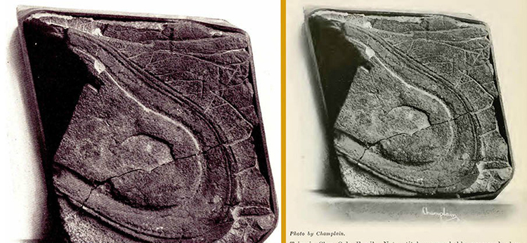 “当我在下山时,我的目光被一块在一堆松散岩石上的化石所吸引。我把它捡起来放入口袋,做更进一步的观察,最后得知这块化石源自一只从脚后跟吸出来的鞋底,而且处于可塑状态。我还发现它是三叠纪时代的石灰岩,而且还贯穿整座丘陵带。”