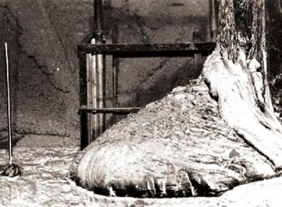 图片:切尔诺贝利堆芯和混凝土的熔融物,据半年多以后测定,表面辐射剂量仍然高达96000毫希伏/小时。而人类只要遭到6000毫希伏/小时辐射的短时照射,就会迅速死亡。