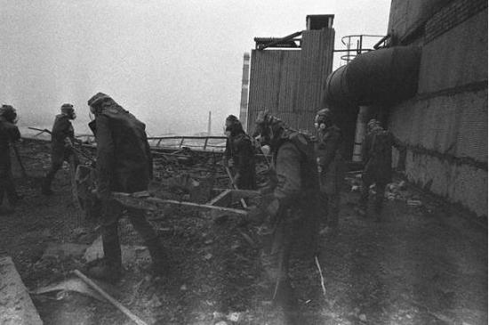 在反应堆周边清理溅落的辐射物,他们身上的防护服几乎毫无作用。
