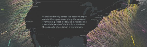 Woodruff当然也看到了这些热门的地图。但他认为在自然条件下,面朝大海的人不是沿着平行于赤道的方向看着大海。所以“海的另一头”指的应该是垂直于海岸线直接面对的地方。他着重考虑了海岸线的曲折和地球的弧度,选取和比较了多种计算方式后才发布了最终的成品。