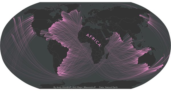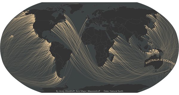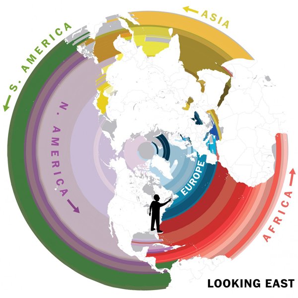 去年,Laris Karklis和Weiyi Cai受到Eric Odenheimer的启发,制作了一批地图,用球极平面投影(stereographic projection)将世界上维度相同的各个国家横跨海洋连接在一起。他们使用了黄色来代表亚洲,蓝色代表欧洲,紫色代表北美,绿色代表南美,红色代表非洲。