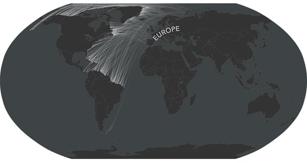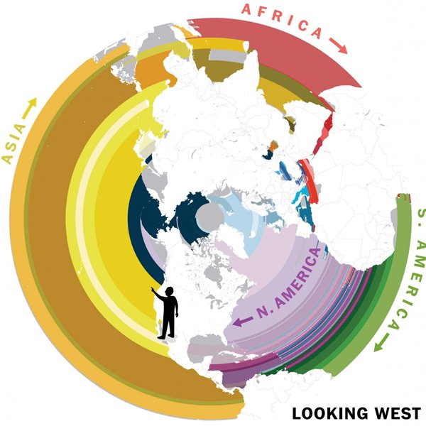在他们横穿太平洋的可视化展现中我们可以发现,北京基本上与旧金山处在同一纬度,东京与洛杉矶差不多,上海、台北和香港则面对着墨西哥的下加利福尼亚半岛。