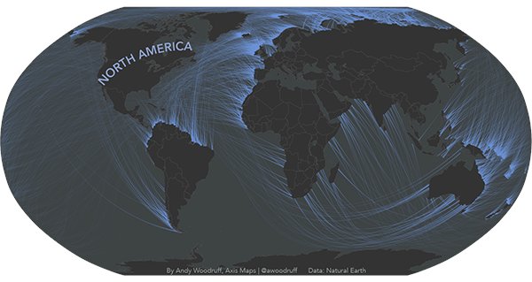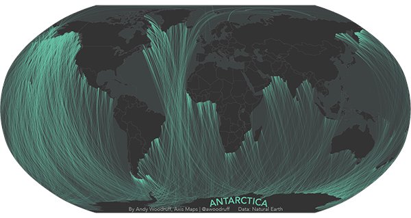 Woodruff意识到,地球上的海岸线千奇百怪。为了弄清海岸线本身的真实方向,他调用了Natural Earth的地图数据,计算出相邻节点的度数。最后在墨卡托投影(Mercator projection)的地图上画出垂直于海岸的线。这些线在地图上看起来似乎有点难以理解,但它们确实是正确的展现方式: