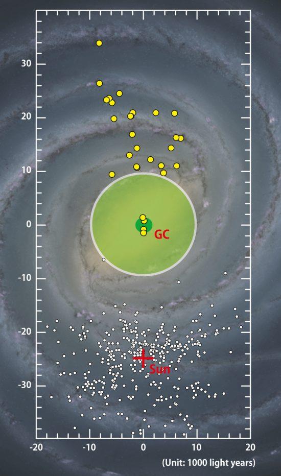 上图蓝点为造父变星,中间黄色部分则几乎不存在造父变星,该区域的半径大约为8,000光年