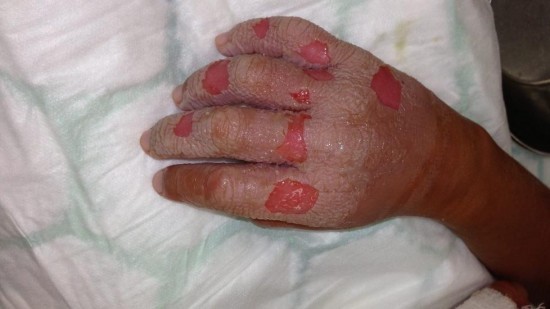 亚当将自己的遭遇PO网,提醒网友说,如果你在阳光下挤柑橘之类的果汁,记得一定要把手洗干净,或者也可用机器榨汁,避免肌肤接触。