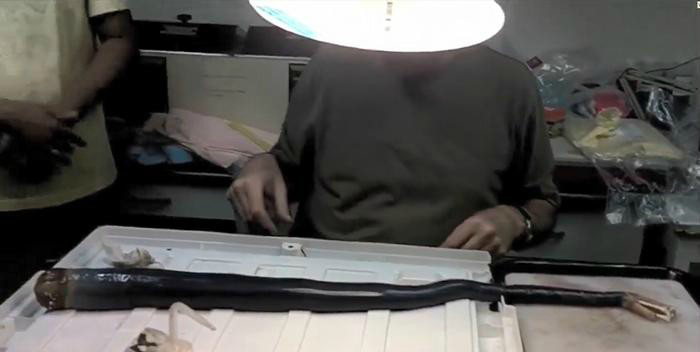 “第一次将管子从容器中取出来是非常壮观的。看到这个巨大的青铜黑色标本是惊人的。一方面来说,我很兴奋看到里面的样子,另一个方面,要解剖这个令人难以置信的稀有标本也有一点吓人的。”