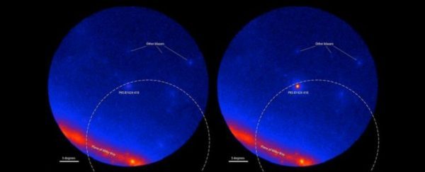 研究小组相信他们找到罪犯:一个已知为耀变体(blazar)的大爆炸,发生在PKS B1424-418星系,大约100亿年前。耀变体发生在一个星系的物质朝向在它中心处的超质量黑洞掉落时,那些物质的一部分最后喷出大喷射流,直接朝向地球。