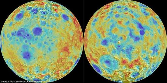 图为谷神星的地形图。图中的蓝色斑点多年来一直是个费解之谜。谷神星表面分布着大量深深的撞击坑,说明它的表面只有不到30%是由冰构成的。