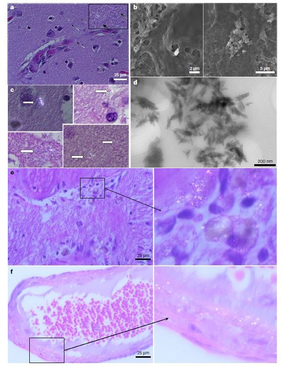 使用偏光显微镜和电子显微镜观察脑组织切片,发现存在塑胶微粒。图片来源:坎彭团队研究论文(Fig. 2)