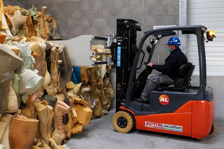 2021年10月8日,一名法国工人正在搬运废弃的聚氨酯泡沫床垫。(Guillaume Souvant/AFP via Getty Images)