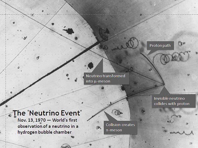 藉由微中子撞击气泡室中氢原子里的质子,进行微中子观测,照片右方三条轨迹的汇集之处便是带电粒子撞击发生处。图/wikimedia