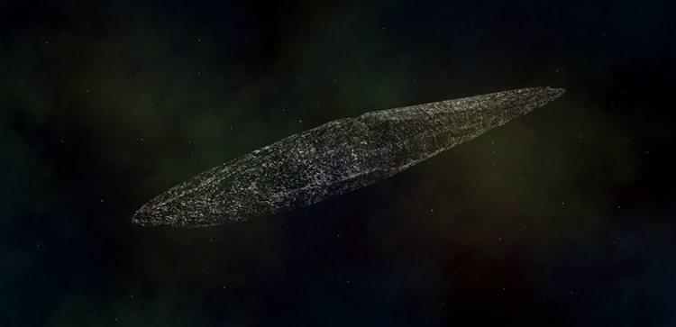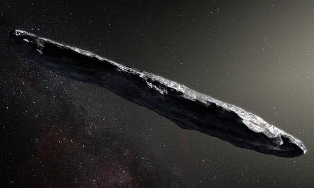 2017年10月Oumuamua在穿过我们的太阳系时被发现,刚开始大家认为它是一颗彗星,后来觉得应该是一颗小行星,但它独特的尺寸(230米长*35米,有些天文学认为长度应该是400米)以及其它特征,被解读为外星飞船。