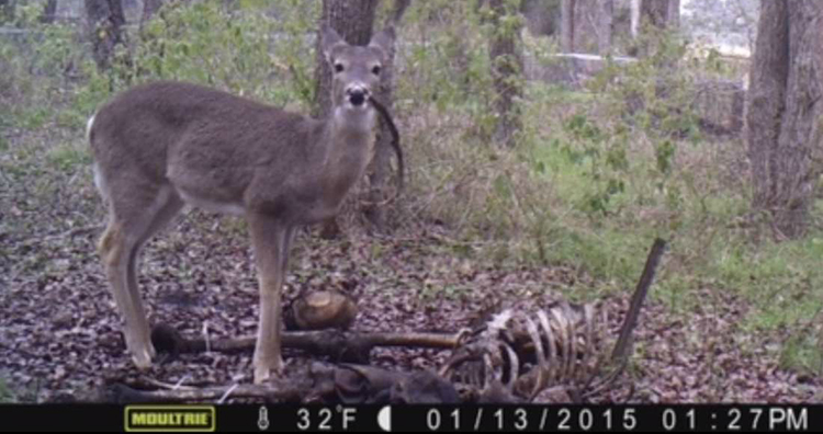 德州州立大学(Texas State University)法医人类学研究所(Forensic Anthropology Research Facility)的动态感应相机记录到一只吃人的鹿。这是一块占地10公顷(26英亩)的“尸体农场(body farm)”,法医科学家在此研究人体如何在野外分解。尽管很大一部分是看到野生动物如何与尸体互动,但他们并不期待白尾鹿来凑一脚。