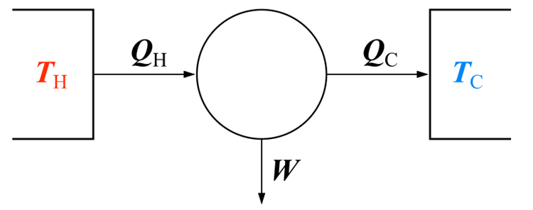 TH可想成燃料的绝对温度,TC可想成环境的绝对温度。此外QH是输入热机的热量,QC是排出的热量,两者之差W即为热机输出的功。