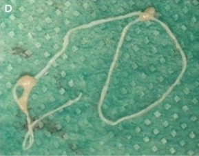 医师很快地用镊子夹住固定肿包,并且直接切除,拿出一条超长的寄生虫。
