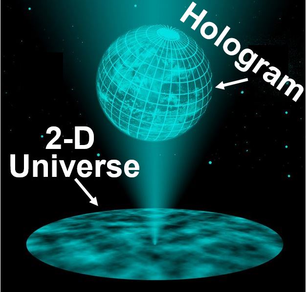 就像二维的萤幕投射出3D全息图一样,这个假说指出,我们这个宇宙的三维立体是从一个二维边界投射出来的。
