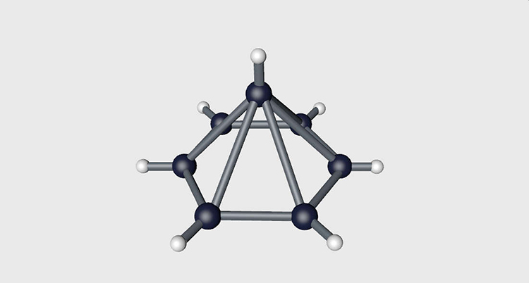 研究小组表示,可以构造一个由碳原子组成的金字塔形状。基座将是一个六角形碳环,顶点和所有六个碳原子相连。因为每一个碳也都与氢原子相连,所以最终碳原子有七个键。