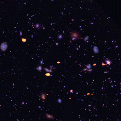 窥视太空深处就等同于看到了宇宙的遥远过去——星系越遥远,它们向地球发射出的光也就越早。哈勃超深场的最遥远星系可以追溯到近乎宇宙的开端(138亿年),超过130亿年。