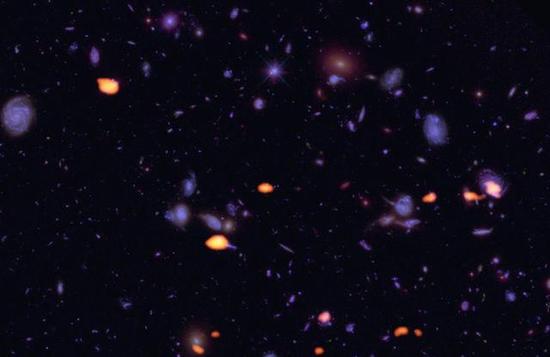 图中橙色的点为ALMA新发现的星系,其他的为哈勃超深场的视角