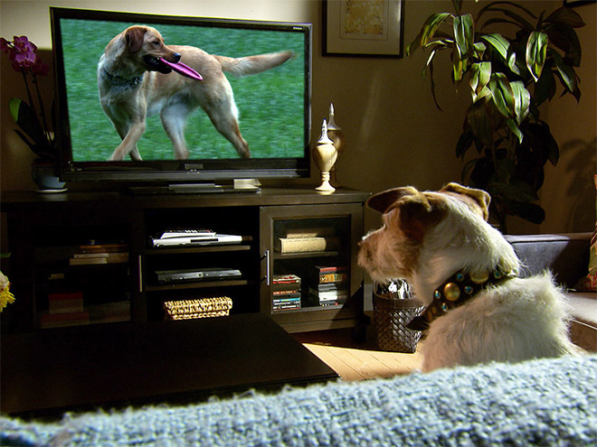 狗,不同于人类,也经常和媒体广告有非常短暂的互动,通常是少于3秒。偏好看一眼电视,而不是像人类专注在电视。研究发现,即使媒体广告是特别为狗设计,大部分的时间它们依然没有在看。因此,对狗来说,理想的电视应该是包含很多的片段,而不是很长的故事剧情。
