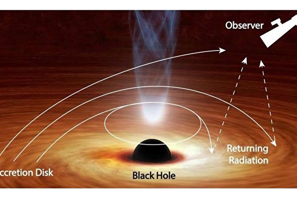 近期一份发表在《天体物理学杂志》(The Astrophysical Journal)上的研究首次提出证据,实际上,不是所有来自黑洞周围吸积盘的光线轻易就能逃逸。一些发出的光线被黑洞巨大的引力牵制,如掷出的回旋镖一般半路折回,再被吸积盘反弹后才能最终逃逸。