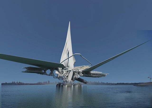 它的三个可扩展走道和碳纤维三重翼板,使它看起来像是属于一些反乌托邦的未来,或是如同New Atlas的报导,像是变形蜻蜓。为了实现未来感,桥梁的走道和太阳能面板并排,使得结构能够产生自己的电力。