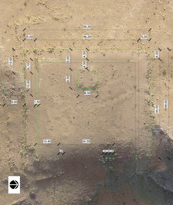 考古学家在空中的高科技眼睛显示出这个结构大约是56乘49公尺(184乘161英尺),它也显示出位于一个巨大平台的8.5乘8.5公尺(28乘28英尺)建筑物。