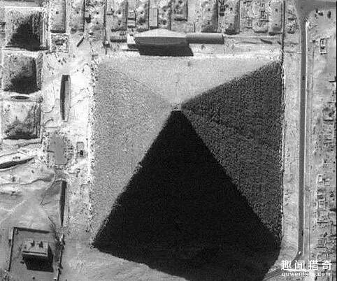 ▼但是由於在至近距离却难以被肉眼观察出来,一定要在一天当中的某个特别时间并在特定角度从空俯瞰才能清楚看到。这就是为什么很多金字塔照片都看不出来有凹陷的现象,但是这张英国空军飞行员P. Groves於1940年拍摄的金字塔照就清楚显示出金字塔的凹陷。”