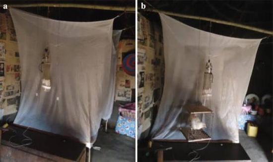 蚊子为什么不喜欢鸡呢?这群科学家猜测,蚊子具有极强的嗅觉,鸡的身上也许有什么气味让蚊子避开它们。于是,他们收集了这些动物身体各部位的样本,发现只有鸡的羽毛散发出来的味道有驱蚊的效果(这样看来,在驱蚊这件事上,拿着鸡毛当令箭还是挺靠谱的)。接着研究人员使用气象色谱和质谱仪器分析了牛、羊和鸡散发的气味分子。他们发现有一些气味分子,比如苧烯(limonene)、壬醛(nonanal)和sulcatone是这些动物共有的,鸡所特有的气味分子有六种,其中已知的分子有四种,分别为hexadecane, naphthalene, isobutyl butanoate 和 trans-limonene oxide,还有两种无法通过气象色谱和质谱仪器分析出来。 接下来,研究人员人工合成了鸡身上所特有的这些化合物,用来测试蚊子的反应:随着剂量的增加,蚊子的反应也更强烈——阿拉伯疟蚊确实会逃避这些分子。 那么,这些分子是否真的能让人类免受蚊虫叮咬呢?研究人员招募了一些志愿者,让志愿者在蚊帐中作为“人肉诱饵”吸引蚊子。研究人员在蚊帐外挂上捕蚊器,捕蚊器旁还有一个散发以上四种气味分子的小瓶子(下图)。作为对照,他们还在一组志愿者的蚊帐外放了一只活鸡。实验的结果显示:无论是鸡的气味分子还是活鸡都能让蚊子远离捕蚊器,而那些散发着其它气味的捕蚊器可以捉到更多的蚊子。
